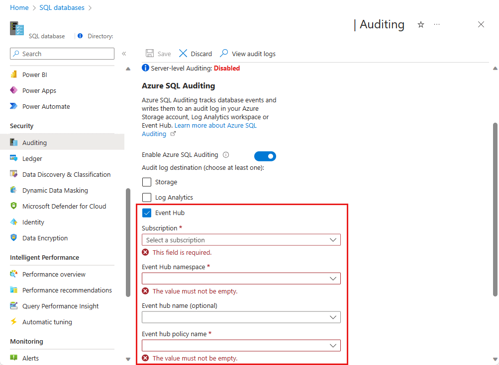 使用 Azure 外部监视器(例如事件中心或 Log Analytics)作为目标配置审核时,将创建名为 SQLSecurityAuditEvents_XXXX-XXXX-XXX 的其他 诊断设置资源,这对于审核正常运行至关重要。