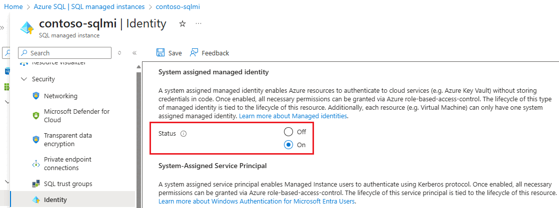 SMI 会在创建后自动分配给 Azure SQL 托管实例。 当您使用 Microsoft Entra 身份验证与 Azure SQL Database 配合使用时,在 Azure 服务主体在 SQL 数据库中创建 Microsoft Entra 用户时,必须分配一个 SMI。