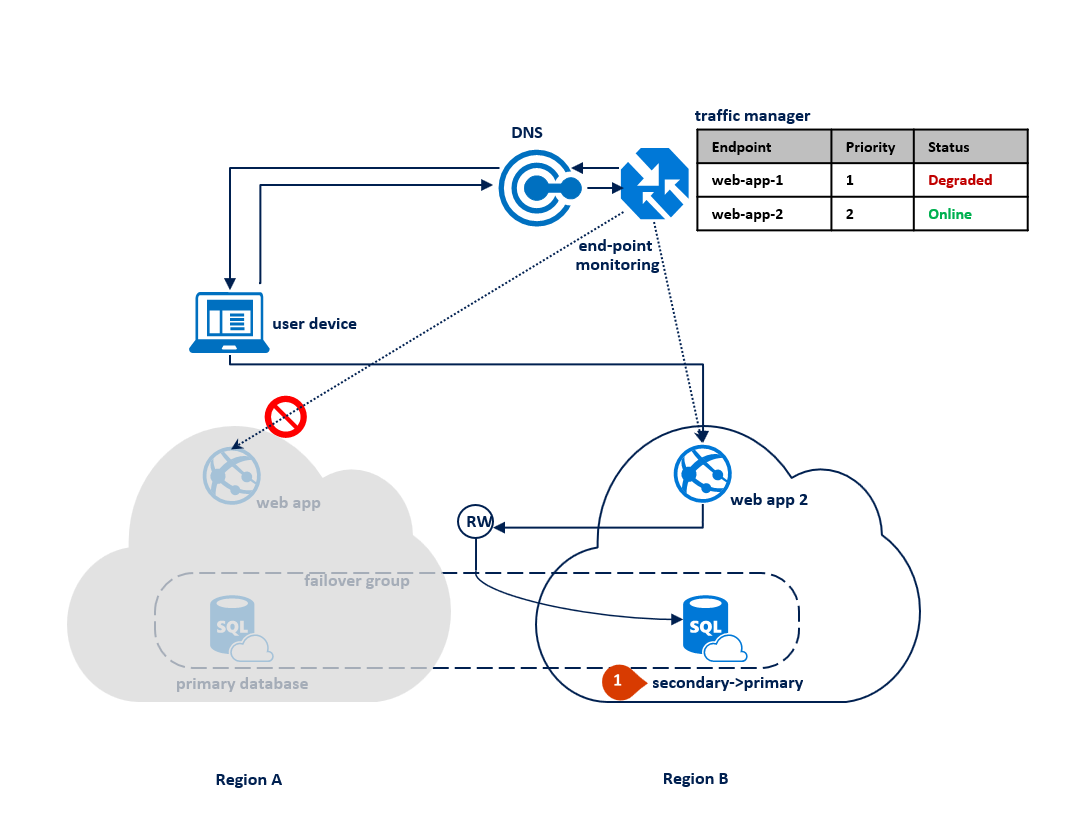 如果区域 B 中发生中断,那么主数据库和辅助数据库之间的复制进程会挂起,但是两者之间的链接不会受影响 (1)。 流量管理器检测到区域 B 的连接中断,并将终结点 Web 应用 2 标记为“降级”(2)。 在这种情况下,应用程序的性能不会受到影响,但数据库会公开,因此,在区域 A 连续发生故障时,数据丢失的风险更高。
