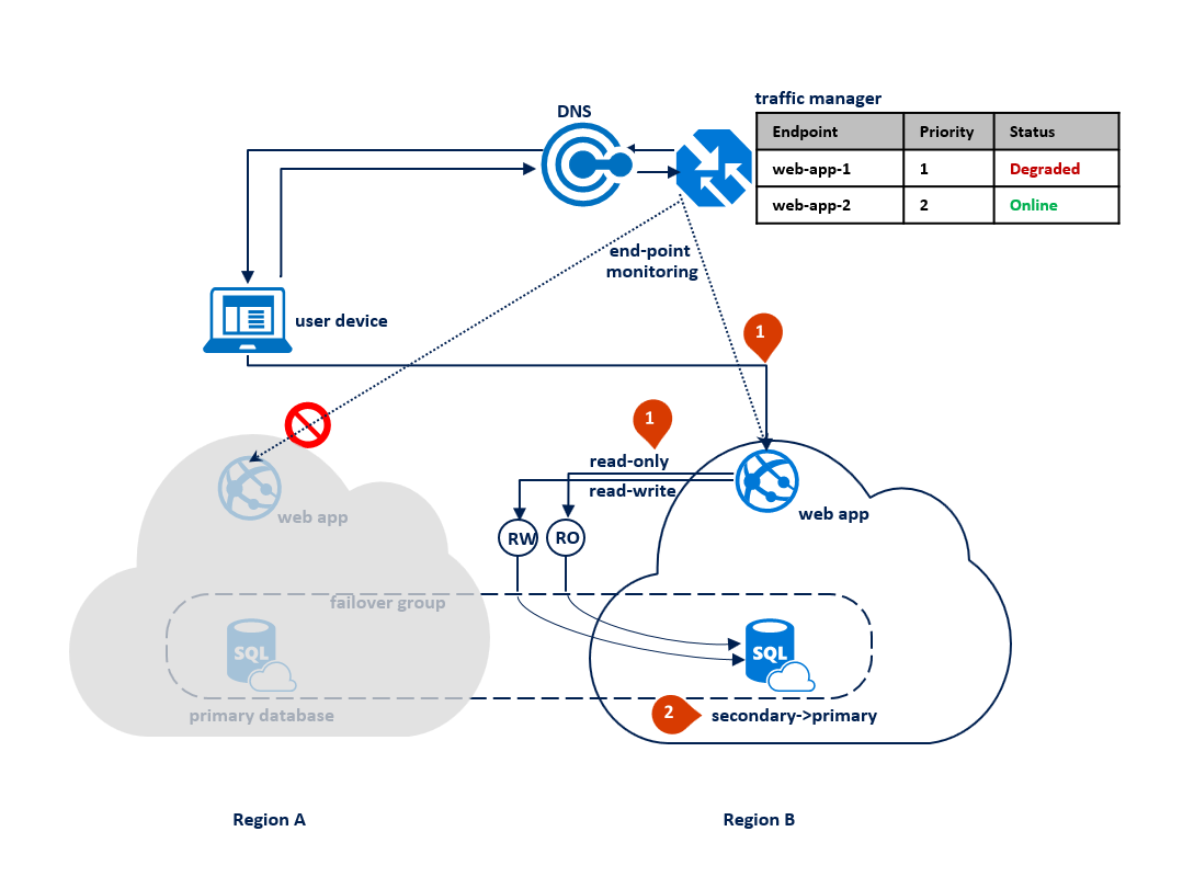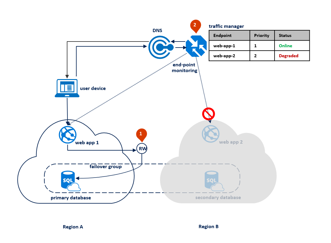 如果在区域 B 中发生中断,流量管理器会在区域 B 中检测到终结点 Web-app-2 的故障,并将其标记为降级(1)。 与此同时,故障转移组将只读侦听器切换到区域 A (2)。 此中断不会影响最终用户体验,但主数据库在中断期间公开。 下图说明了次要区域中的失败: