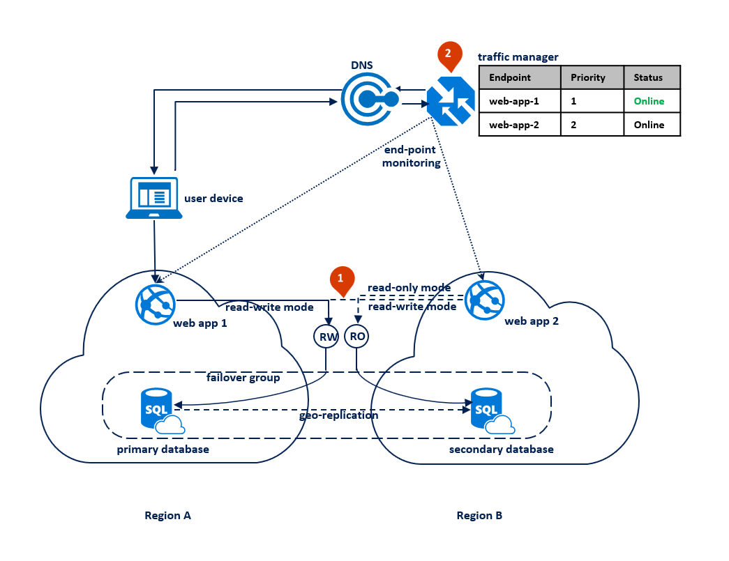 此模式下,读写连接开始出现超时错误时,应用程序会切换到只读模式。 Web 应用程序会部署到这两个区域,并包含一个读写侦听器终结点连接和另一个不同的只读侦听器终结点连接 (1)。 流量管理器配置文件应使用优先级路由。 应为每个区域中的应用程序终结点启用终结点监视 (2)。