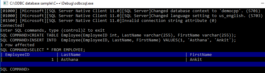 祝贺! 现在已成功在 Windows 上使用 C++和 ODBC 连接到 Azure SQL。 可以继续阅读如何为 Linux 平台执行相同操作的内容。