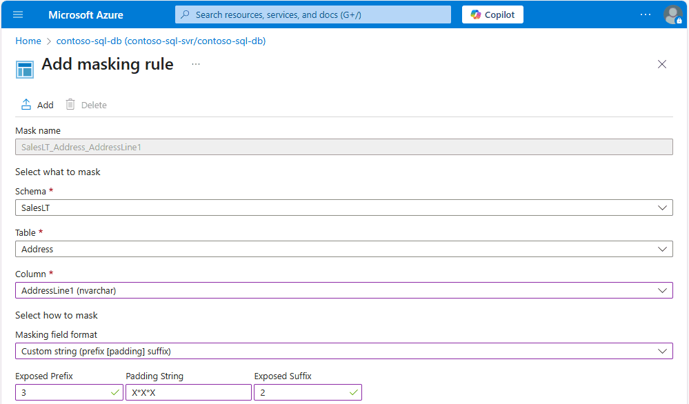 选择“ 在 数据掩码规则页中添加”以更新动态数据掩码策略中的掩码规则集。