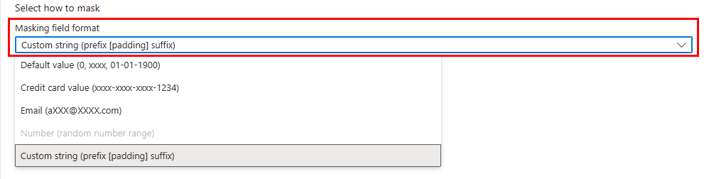 在 “动态数据掩码 配置”页中,你可能会看到建议引擎已标记用于掩码的某些数据库列。 若要接受建议,请选择一个或多个列 的“添加掩码 ”,并根据此列的默认类型创建掩码。 可以通过选择掩码规则并将掩码字段格式编辑为所选的不同格式来更改掩码函数。 选择“保存”以保存设置。 在以下屏幕截图中,可以看到示例