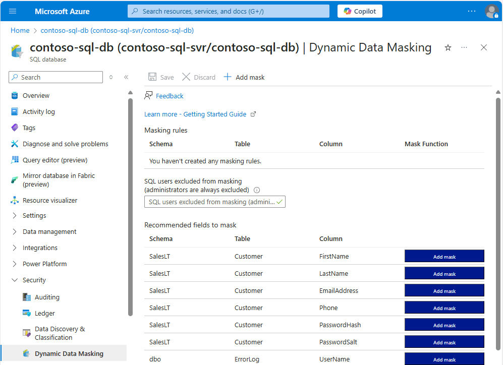 在“ 安全性 ”部分下,选择 “动态数据掩码”。