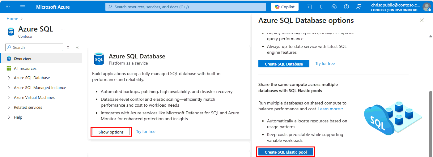 在 Azure SQL 数据库选项 窗口中,选择“ 创建 SQL 弹性池”。