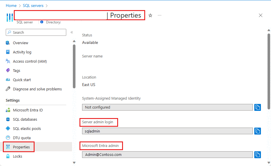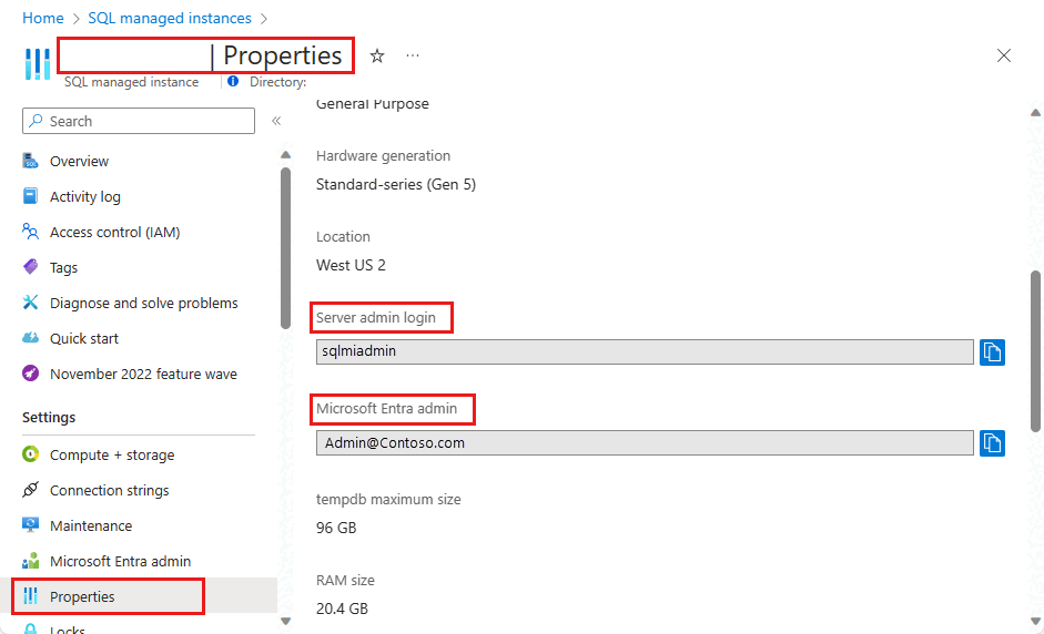 若要确定服务器管理员帐户,请打开 Azure 门户,然后浏览到逻辑服务器或托管实例的“属性”选项卡:
