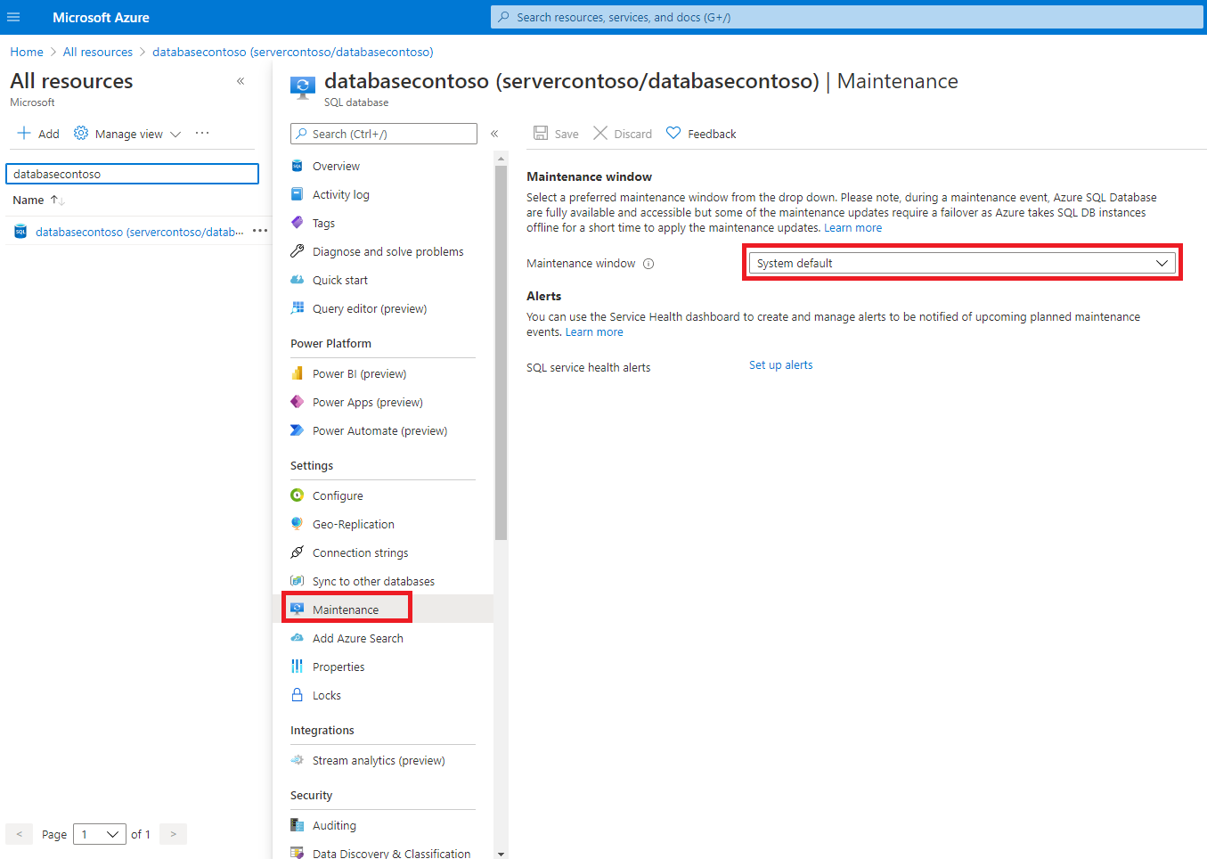 “维护”页面仅适用于支持维护窗口配置的数据库和弹性池。 如果页面不可用,则数据库或池不支持维护窗口配置。