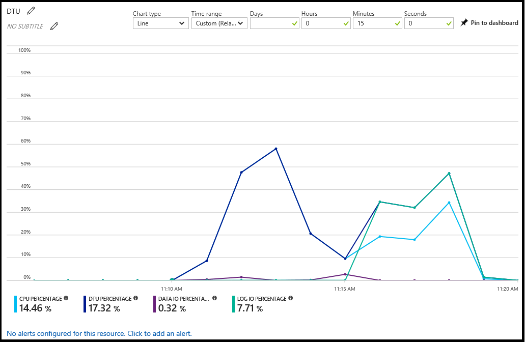 Azure 门户通过选择数据库并选择“概述”窗格中的图表来显示数据库的利用率。 可以修改图表以显示多个指标,包括 CPU 百分比、DTU 百分比、数据 IO 百分比、会话百分比和数据库大小百分比。