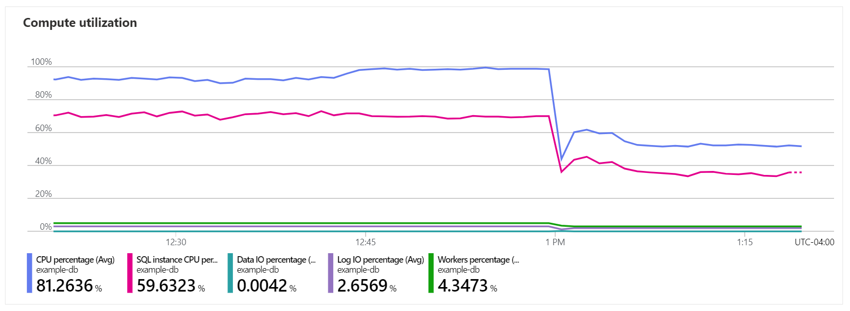 此指标表示 CPU 消耗与数据库或弹性池用户工作负载限制之间的关系(以 vCore 数量表示)。 有关详细信息,请参阅诊断和排查 Azure SQL 数据库上的高 CPU 问题。 |