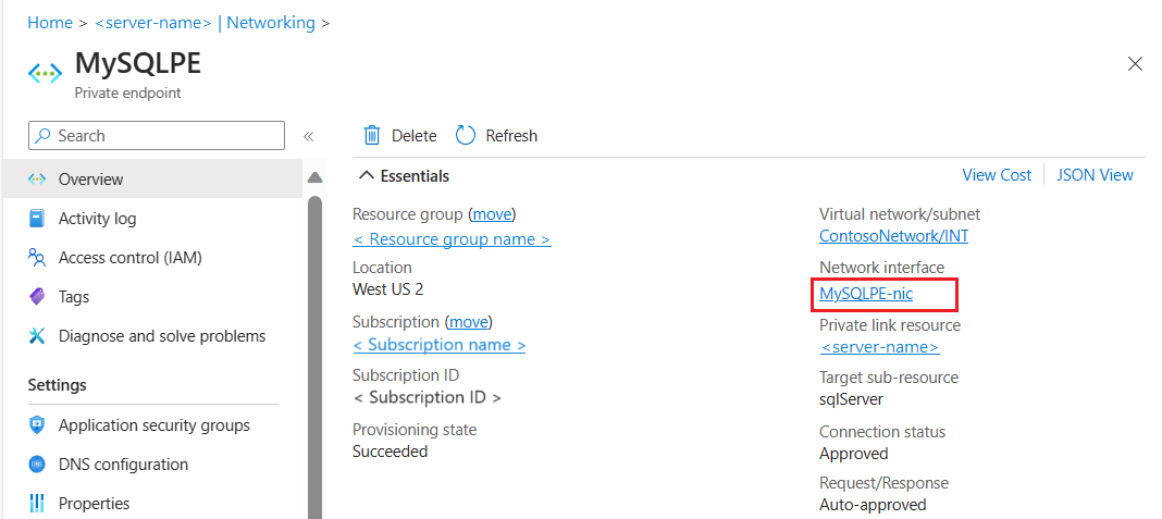 此操作会将你转到“专用终结点概述”页。 选择“网络接口”链接以获取专用终结点连接的网络接口详细信息。