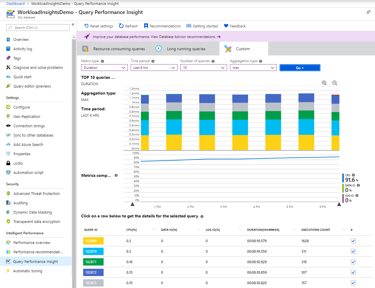 对于数据库性能建议,请在“查询性能见解”导航窗格中 为 Azure SQL 数据库选择数据库顾问性能建议 。