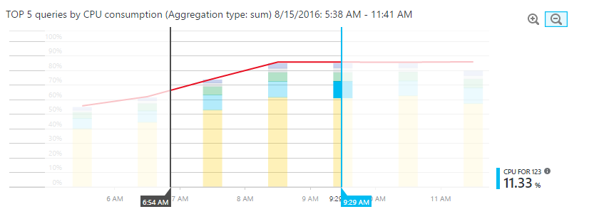 例如,如果某个查询只是在几分钟时间内利用了 100% 的 DTU,Query Performance Insight 中的 DTU 线条会将整个小时的消耗量显示为 100%(最大聚合值的结果)。