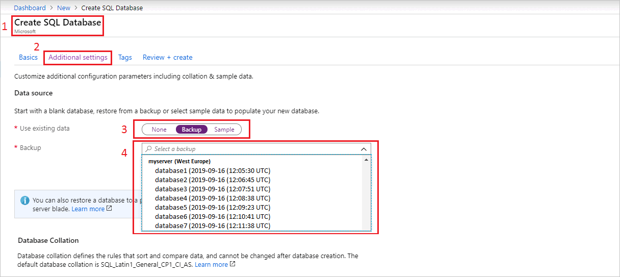 在 Azure 门户中,新建一个单一数据库,然后选择可用的异地还原备份。 新建的数据库包含地理恢复的备份数据。