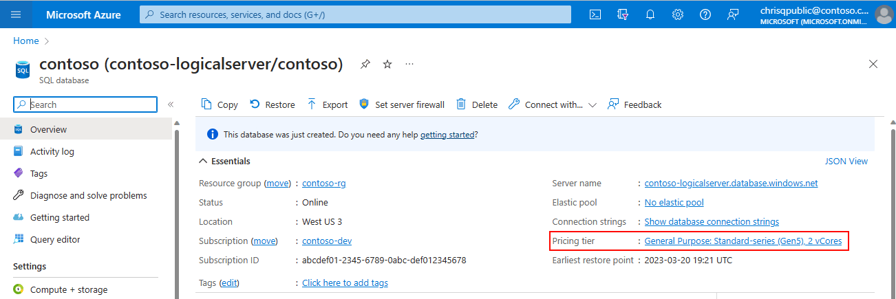 Azure SQL 数据库的概述页上 Azure 门户的屏幕截图。定价层“常规用途:标准系列(Gen5),2 个 vCore”突出显示。