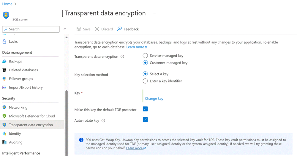 也可以在 Azure SQL 数据库的数据库级别启用自动密钥轮换。 如果只想为服务器上的一个数据库或数据库子集启用自动密钥轮换,这非常有用。 有关详细信息,请参阅使用数据库级别客户管理的密钥进行 TDE 标识和密钥管理