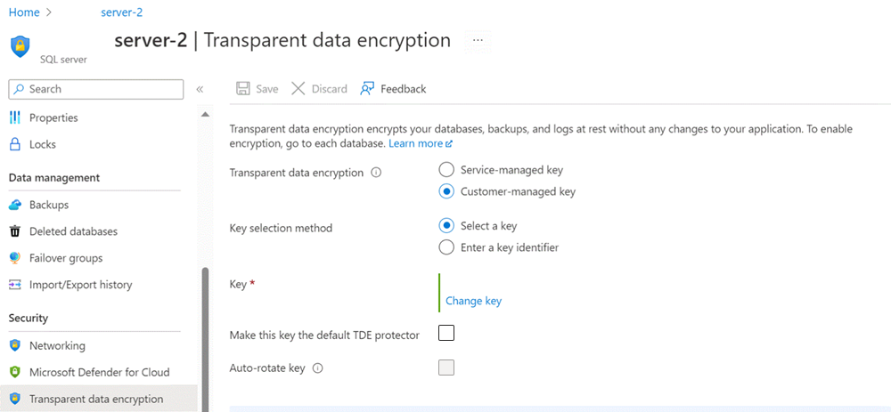 在 Azure 门户中使用 CMK 配置 TDE 时,可以使用不同的密钥保管库密钥配置主服务器和辅助服务器。 在 Azure 门户中,用于保护主服务器的密钥也与保护已复制到辅助服务器的主数据库的密钥相同,这并不明显。 但是,可以使用 PowerShell、Azure CLI 或 REST API 来获取有关在服务器上使用的密钥的详细信息。 这表明自动轮换密钥已从主服务器传输到辅助服务器。