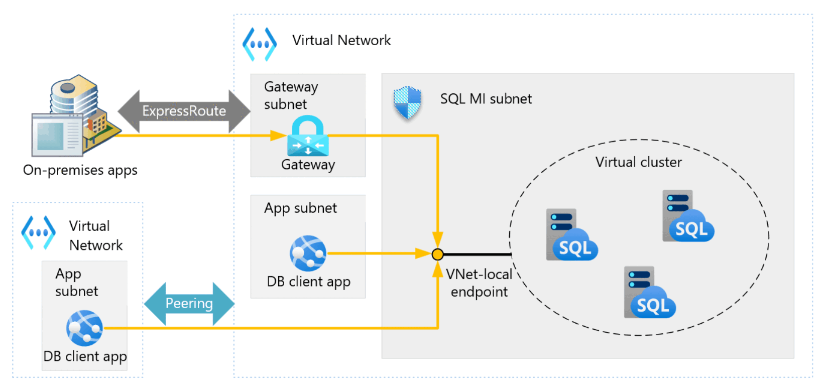 客户应用程序可连接到 SQL 托管实例,还可查询和更新虚拟网络、对等虚拟网络或通过 VPN 或 Azure ExpressRoute 连接的网络中的数据库。