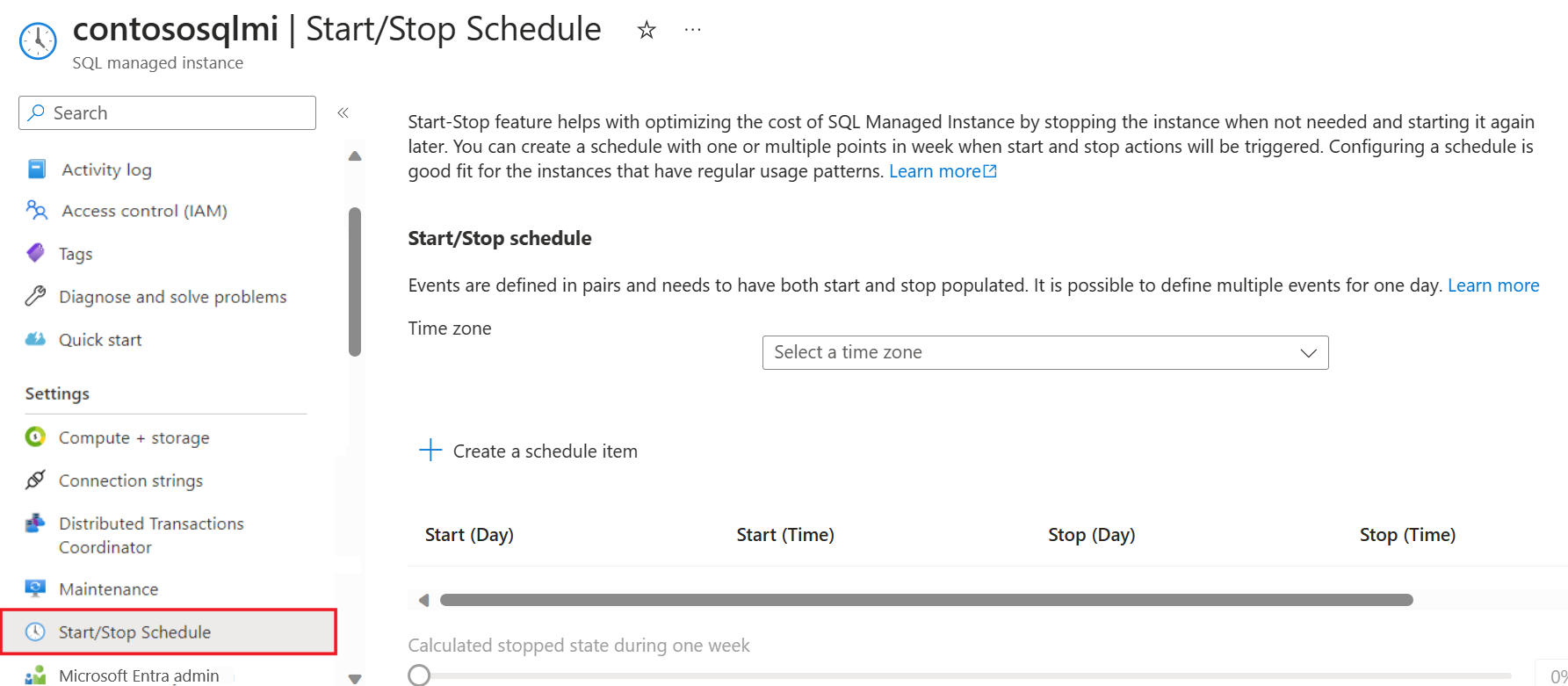 SQL 托管实例的“启动/停止计划”页的屏幕截图。