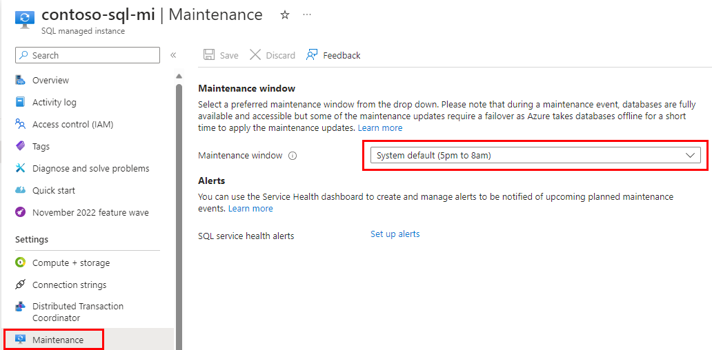 SQL 托管实例“维护”页的屏幕截图。
