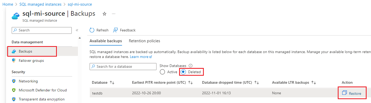 若要使用 Azure 门户还原已删除的 SQL 托管数据库,请执行以下作: