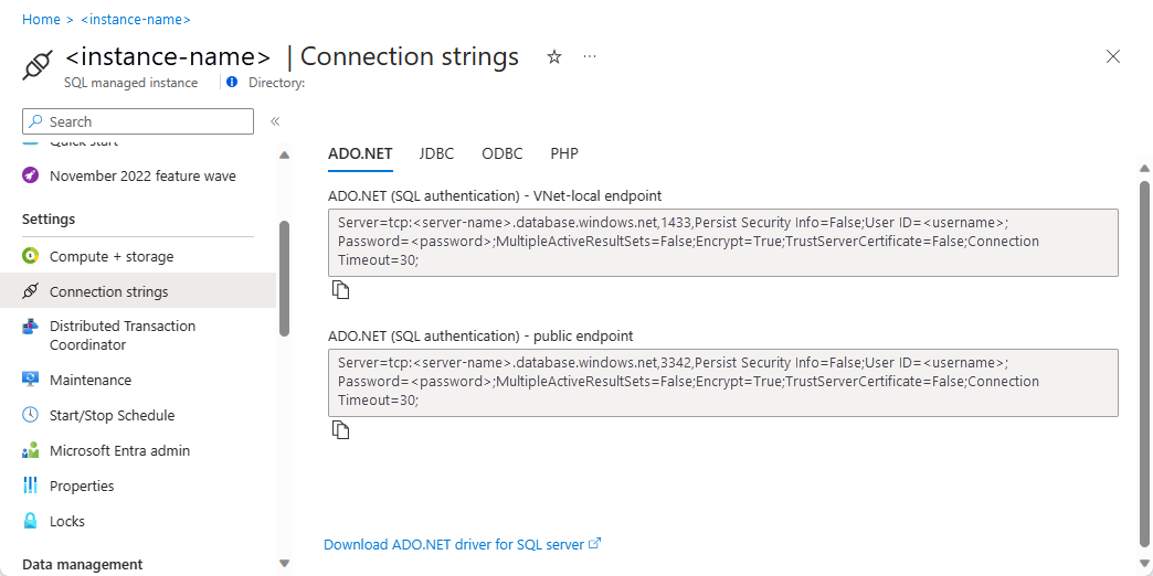 1. 导航到已为公共终结点启用的 SQL 托管实例配置页。 选择“设置”配置下的“连接字符串”选项卡。