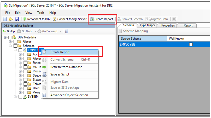 右键单击要迁移的 Db2 架构,然后选择“创建报表”。 这将生成一个 HTML 报表。 或者,可以在选择架构后,从导航栏中选择“创建报表”。