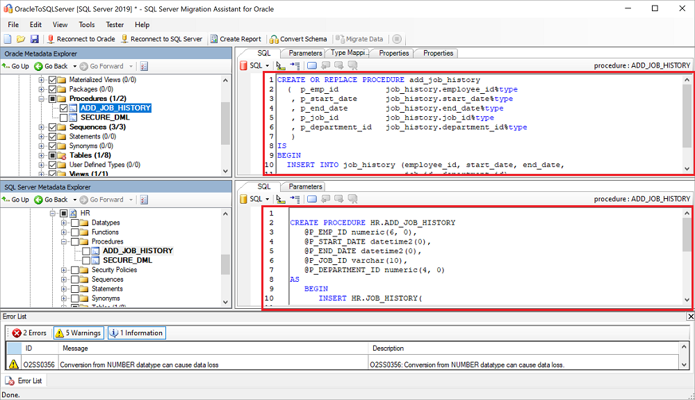 将转换后的 Transact-SQL 文本与原始存储过程进行比较,并查看建议: