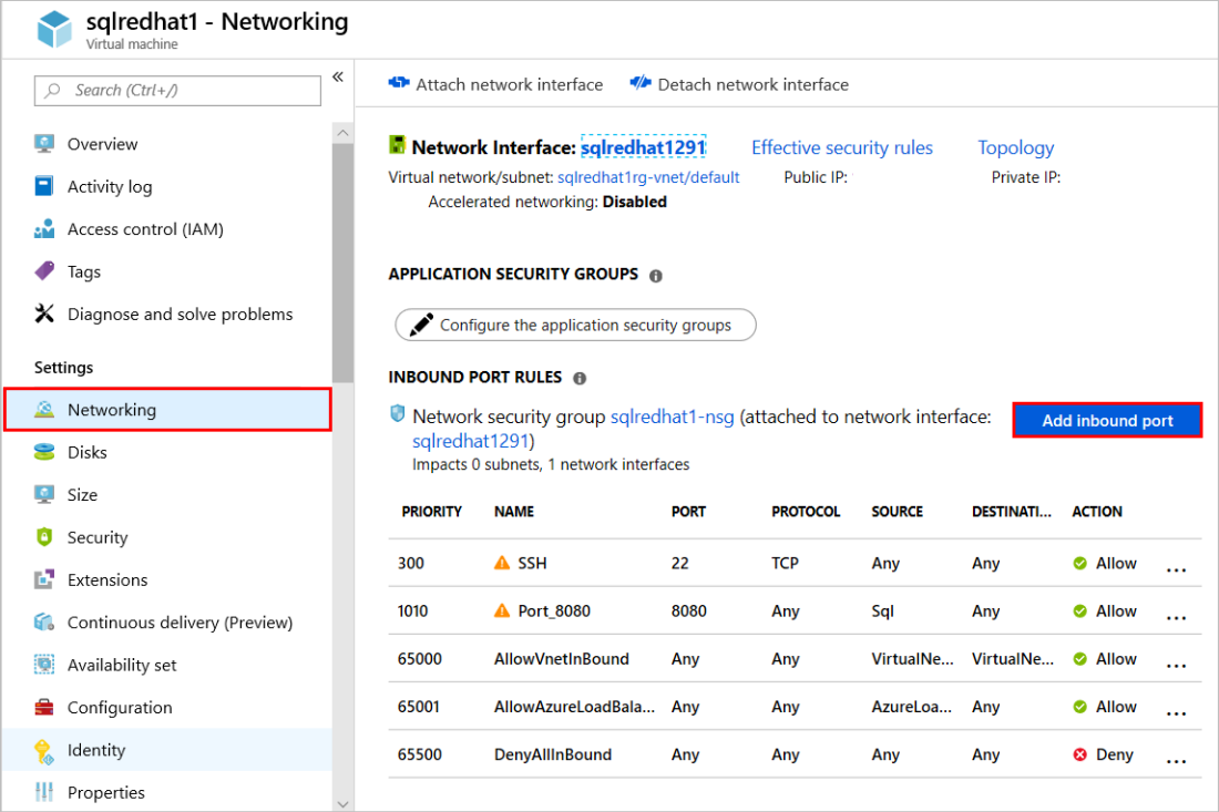 如果需要远程连接到 Azure VM 上的 SQL Server,必须在网络安全组上配置入站规则。 该规则允许 SQL Server 所侦听的端口(默认为 1433)上的流量。 以下步骤演示如何使用此步骤所对应的 Azure 门户。
