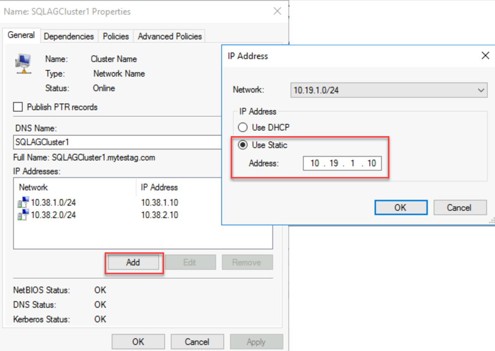 在 Windows Server 2019 上,群集创建一个 分布式服务器名称而不是 群集网络名称。 如果您正在使用 Windows Server 2019,请跳到 为可用性组侦听器添加 IP 地址。 可以使用 PowerShell 创建群集网络名称。 有关详细信息,请查看博客文章故障转移群集:群集网络对象。