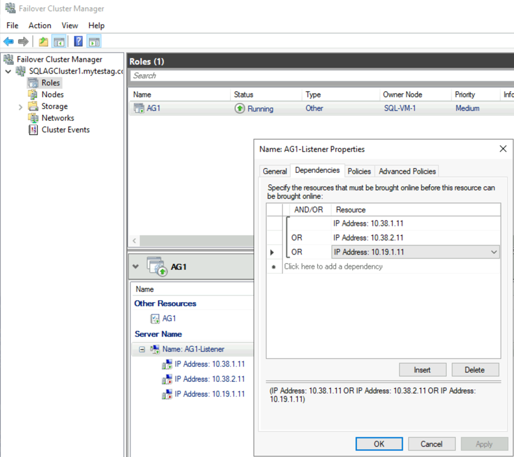 再次打开 “群集属性 ”对话框,然后选择“ 依赖项 ”选项卡。为两个