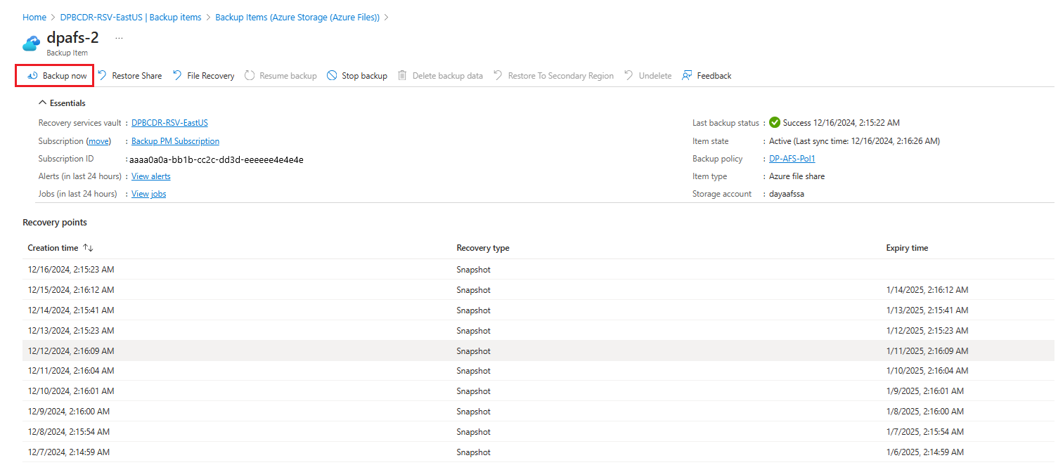 有时候,可能需要在备份策略计划的时间之外生成备份快照或恢复点。 生成按需备份的常见原因是在配置备份策略之后。 可能需要等待数小时或数天才会拍摄快照,具体取决于备份策略中的计划。 若要在该备份策略发挥作用之前对数据进行保护,可以启动按需备份。 在对文件共享进行计划内更改之前,通常需要创建按需备份。