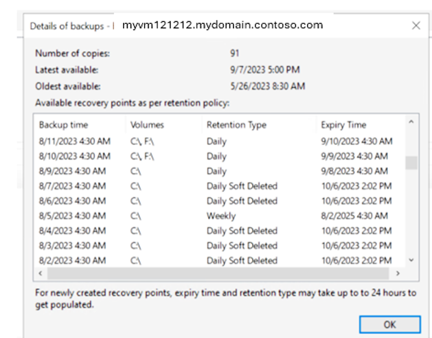 - 在“可用恢复点”下 ,选择“查看详细信息”以列出所有可用的恢复点。