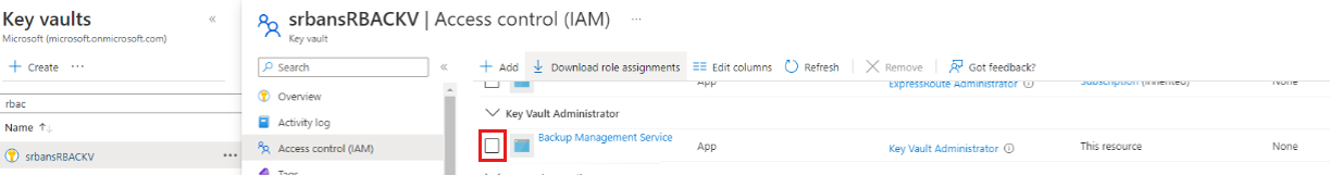 若要使用 Azure 基于角色的访问控制(RBAC)启用的密钥保管库为 ADE 加密的 VM 启用备份,请通过为密钥保管库的 访问控制 添加角色分配,将 Key Vault 管理员角色分配给备份管理服务Microsoft Entra 应用。
