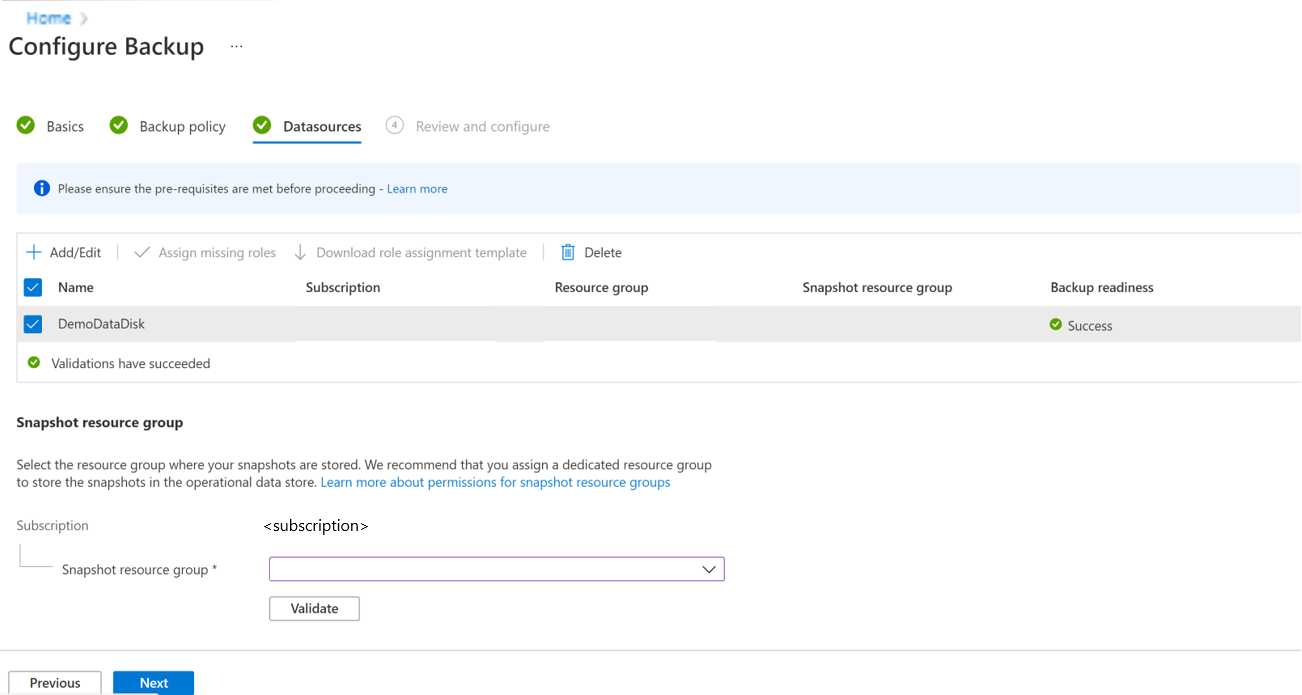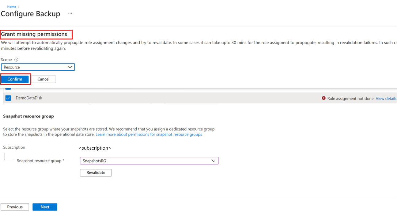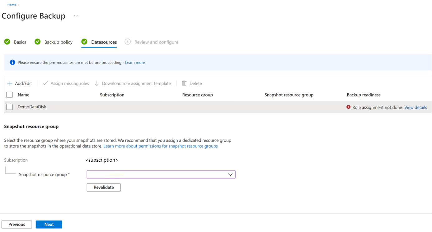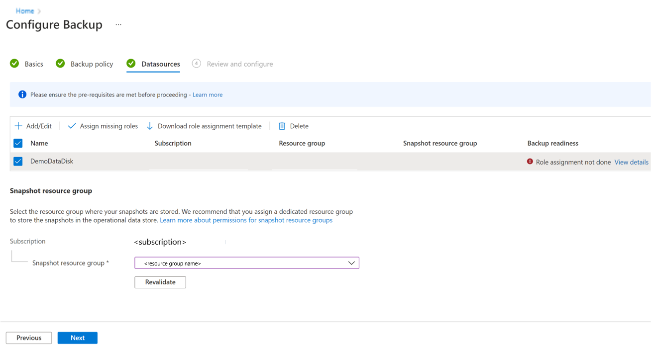 如果 “角色分配未完成 ”错误消息显示在 “备份就绪状态 ”列中,则备份保管库托管标识需要对一个或多个所选磁盘和/或快照资源组具有角色权限。