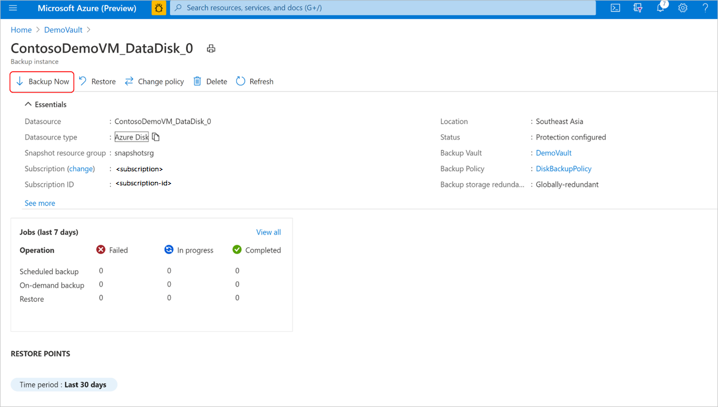 可以随时为Azure磁盘运行按需备份。 如果要在备份策略中定义的计划备份时间之外创建备份,此作非常有用。