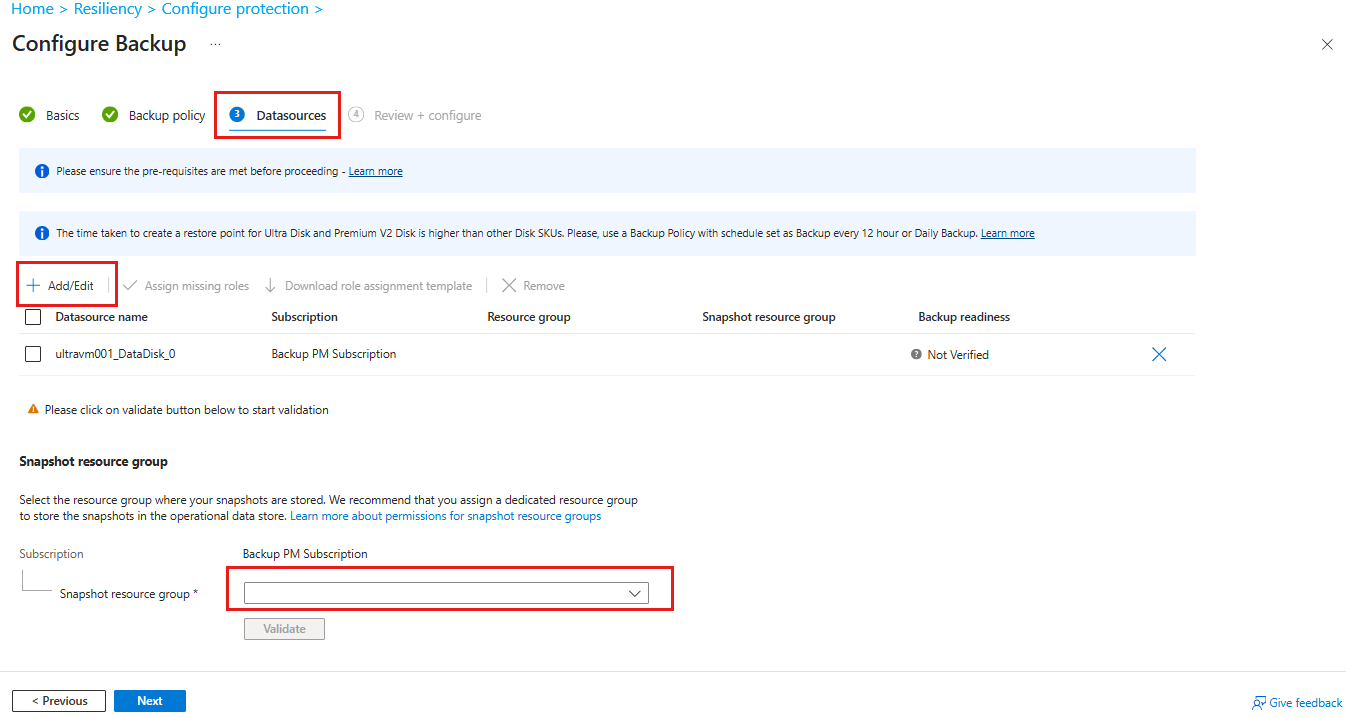 选择 “快照资源组 ”,然后选择“ 验证 ”以启动先决条件检查。