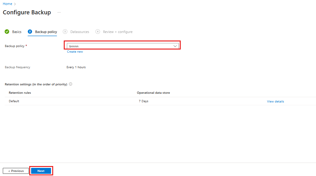 在 “备份策略 ”选项卡上,选择备份策略,然后选择“ 下一步”。