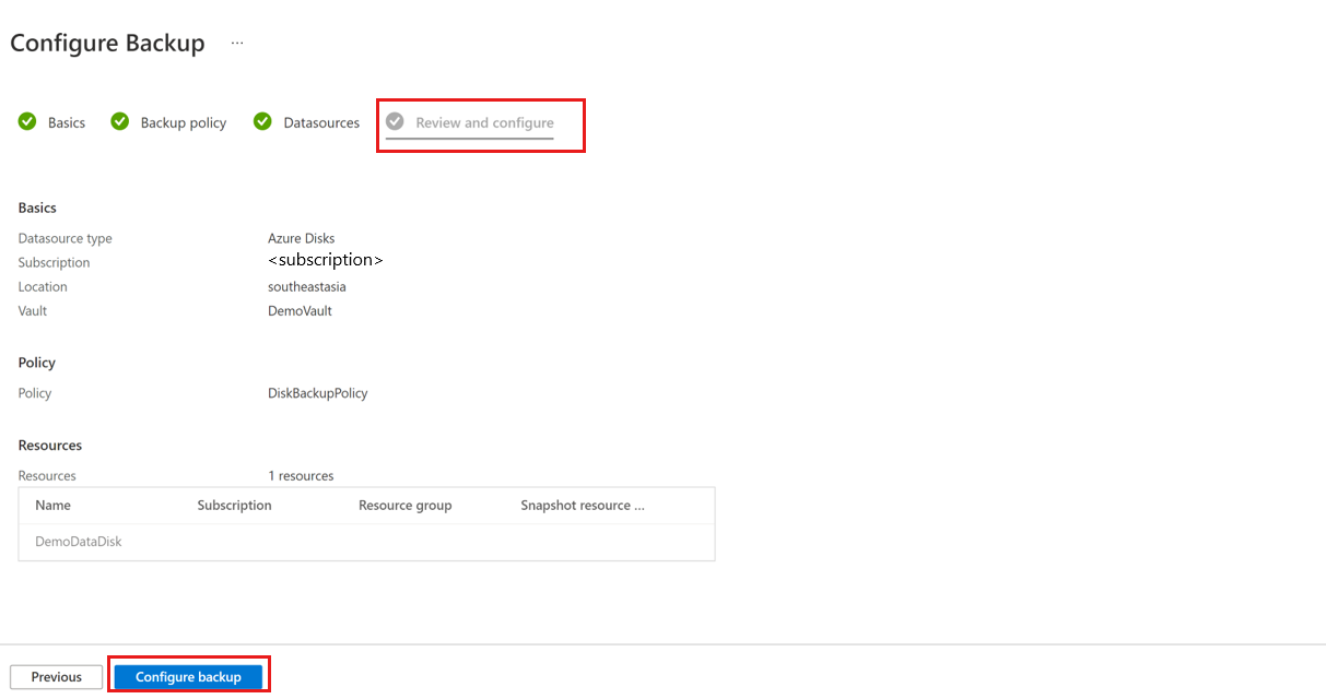 在“ 查看和配置 ”选项卡上,选择“ 配置备份 ”以完成所选磁盘的备份配置。