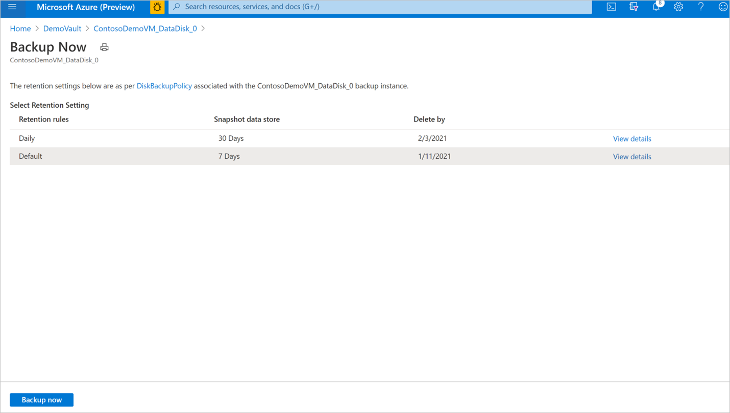 选择与备份策略关联的一个保留规则。 此保留规则确定此按需备份的保留期。 选择“立即备份”,开始备份。