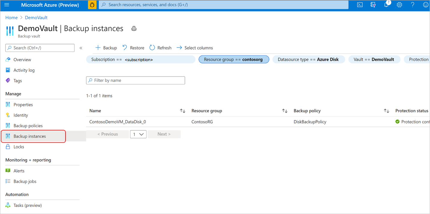 在上一步中创建的“DemoVault 备份保管库”中,转到“备份实例”并选择“备份实例”。