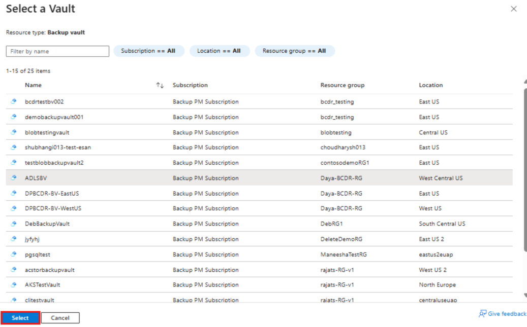 在 “选择保管库 ”窗格中,从创建的列表中选择保管库,然后单击“ 选择”。