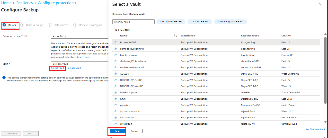 在 “选择保管库 ”窗格中,从创建的列表中选择备份保管库,然后单击“ 选择”。