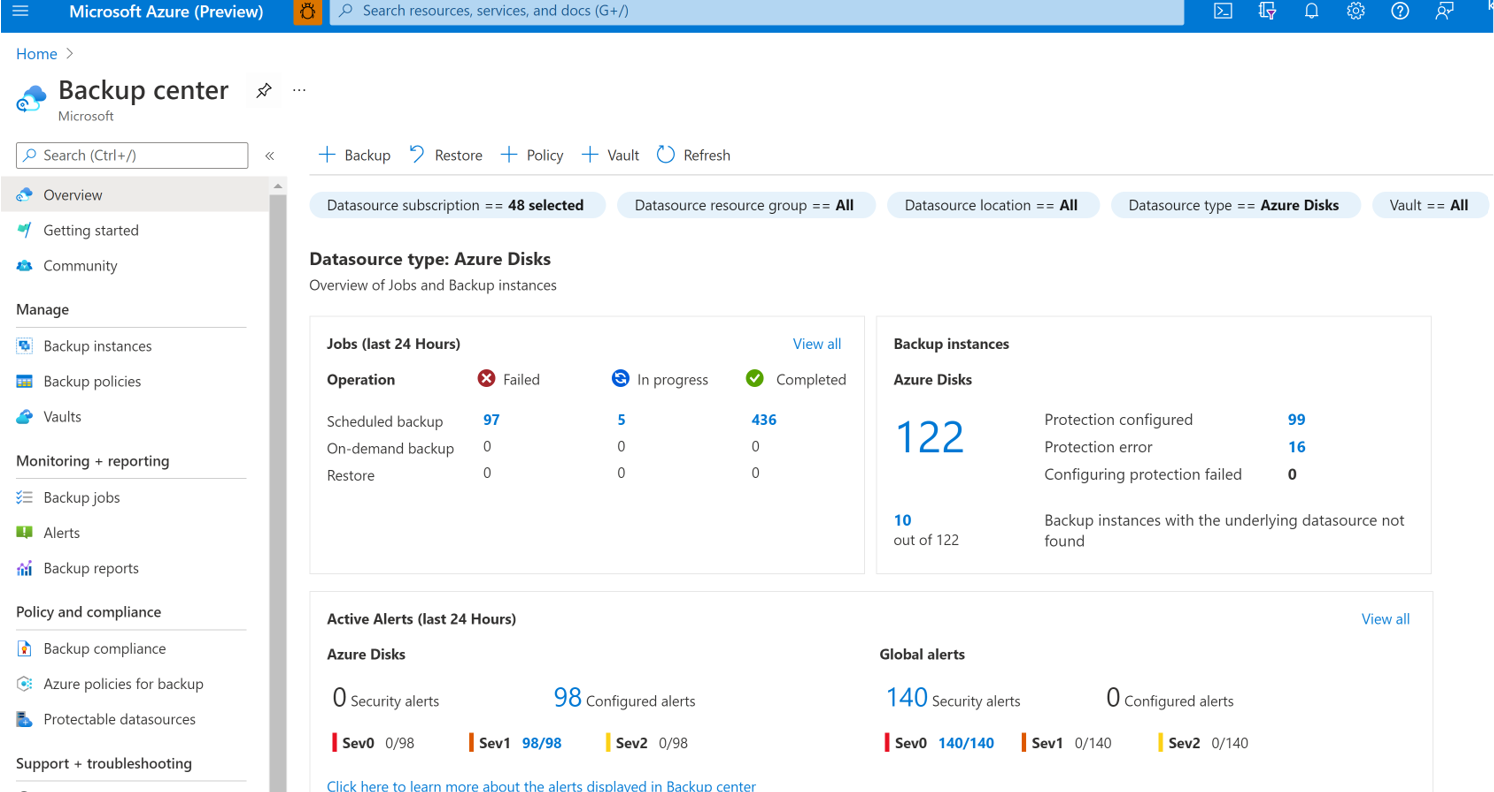 有关Azure磁盘备份区域可用性、支持方案和限制的详细信息,请参阅 support 矩阵。