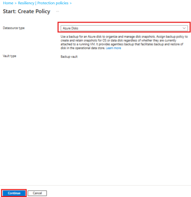 在 Start: Create Policy 窗格中,选择 Datasource type 作为 Azure disk,然后选择 Continue。