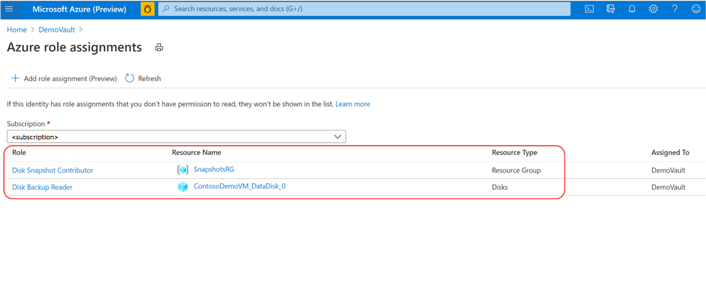 将 Disk Snapshot Contributor 角色分配给资源组中备份保管库的托管标识,在该资源组中,备份由 Azure Backup 服务创建和管理。 磁盘快照存储在订阅内的资源组中。 若要允许Azure Backup服务创建、存储和管理快照,需要向备份保管库提供权限。