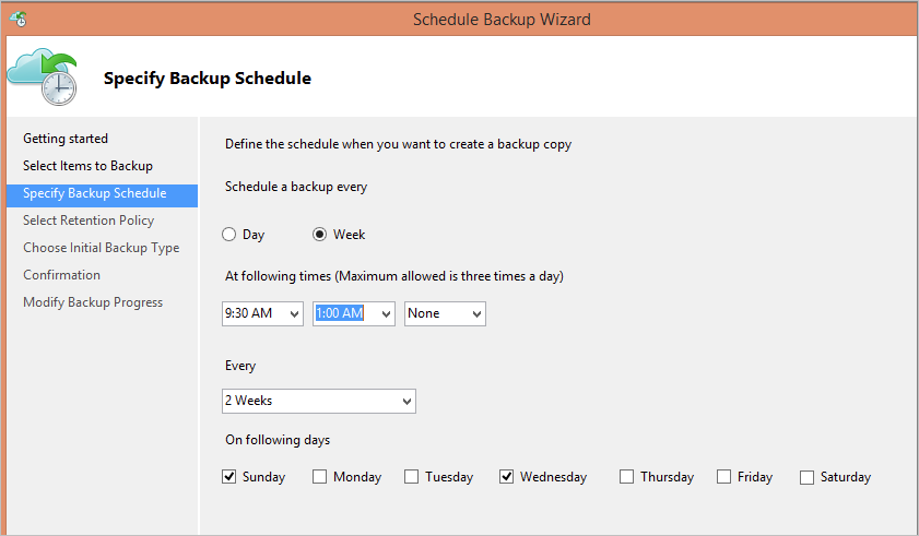 在“指定备份计划”页上,指定何时创建每日或每周备份。 然后,选择“下一步”。