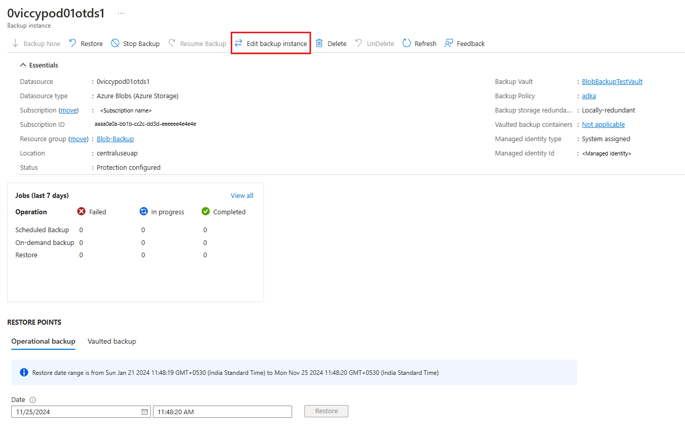 在“备份实例”边栏选项卡上,选择要更改备份策略的备份实例,然后选择“编辑备份实例”。