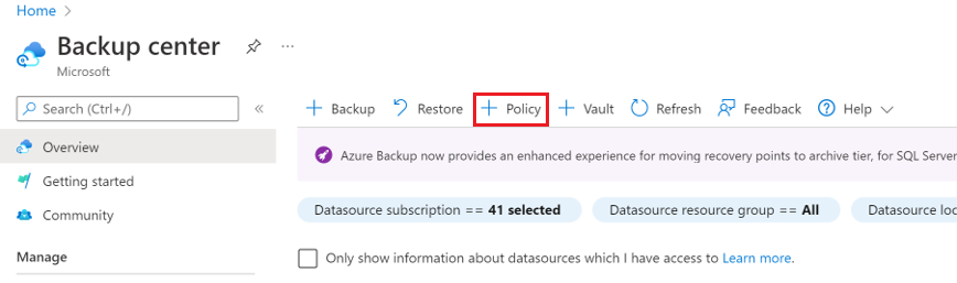 转到备份中心>概述,然后选择+ 策略。