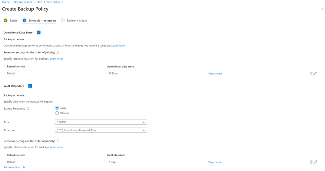 在“计划 + 保留”选项卡上,输入数据存储的“备份详细信息”、计划和这些数据存储的保留(如果适用)。